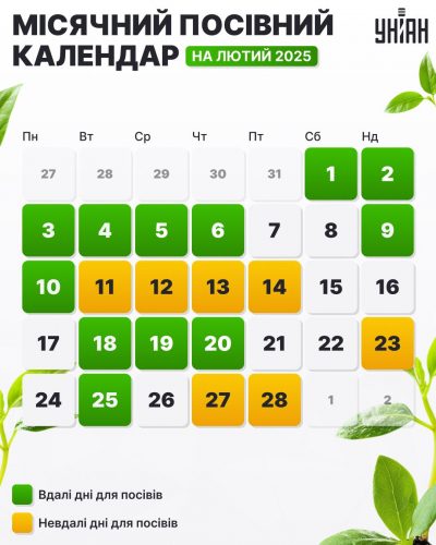 Найвдалішими днями для посіву різних культур у лютому 2025 року будуть: 1-10, 15, 18-21, 25 лютого — тепличні культури та розсада овочів 1-4, 8, 15-16, 20, 22, 25 лютого — зелень, прянощі, салати 2-5, 9-10, 18, 25-26 лютого — саджанці дерев та чагарників