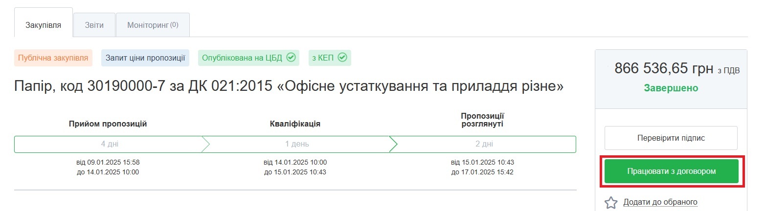 На сторінці закупівлі натисніть кнопку “Працювати з договором”: Також можете скористатись розділом “Мої підписані договори”: В цьому розділі у …