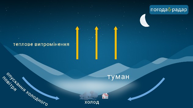З настанням темряви і в тиху погоду над землею в низьких місцях починають утворюватися тонкі шари туману. Вночі земля поступово остиває, що призводить до охолодження і нижніх шарів повітря. Коли прохолодне повітря стикається з теплим, утворюється туман.